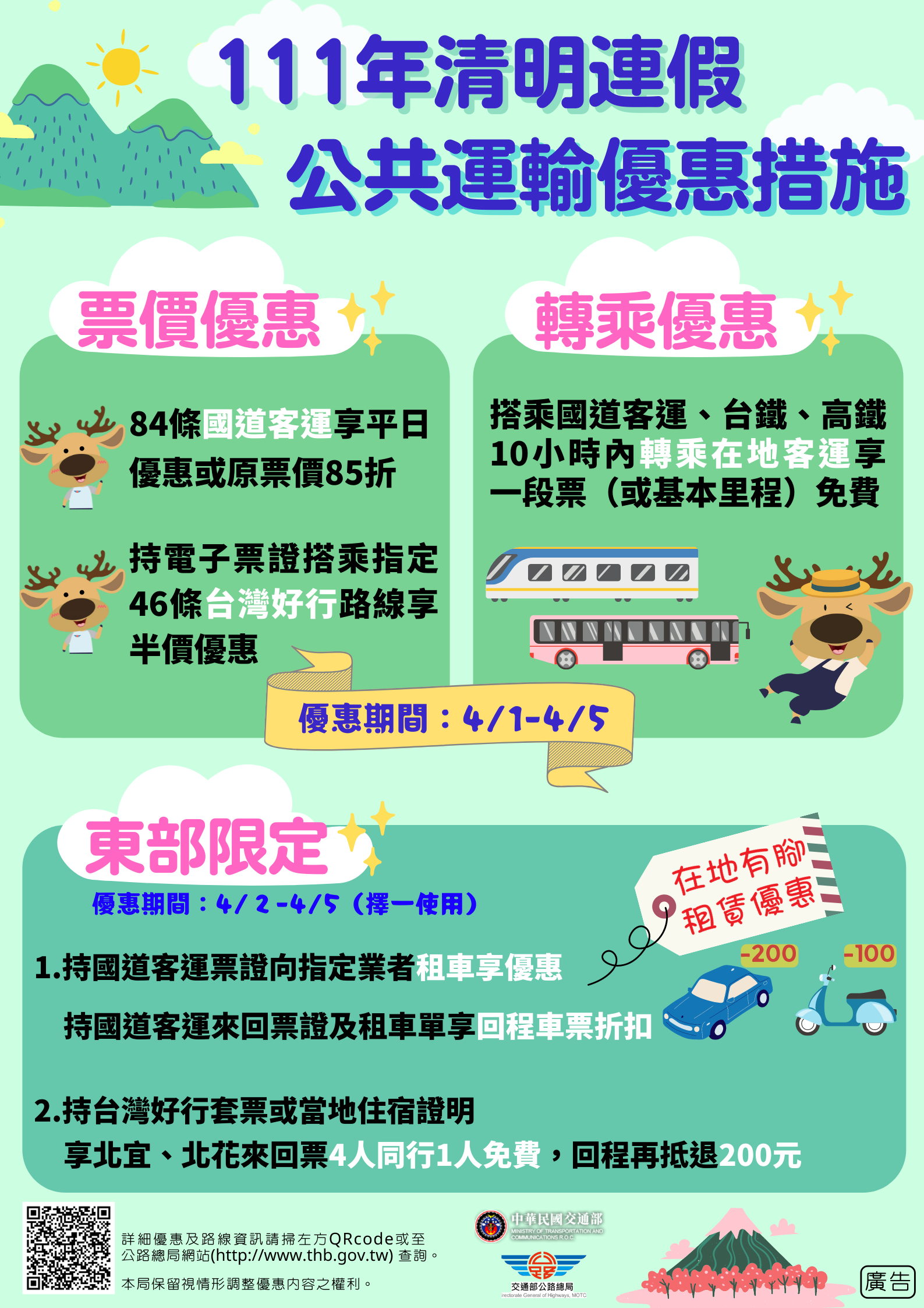 22 3 月 111年清明節連續假期提供搭乘公路公共運輸享多項優惠案 By 王昱昇 正心校內大小事 0 回應s 公路總局於111年清明節連續假期提供搭乘公路公共運輸享多項優惠案,全校師生可參考運用,優惠事項如附件。 置頂截止日期: 2022-04-05附件檔案: 1111291873_1_公運優惠措施海報_111D2012401-01.png 瀏覽次數:998