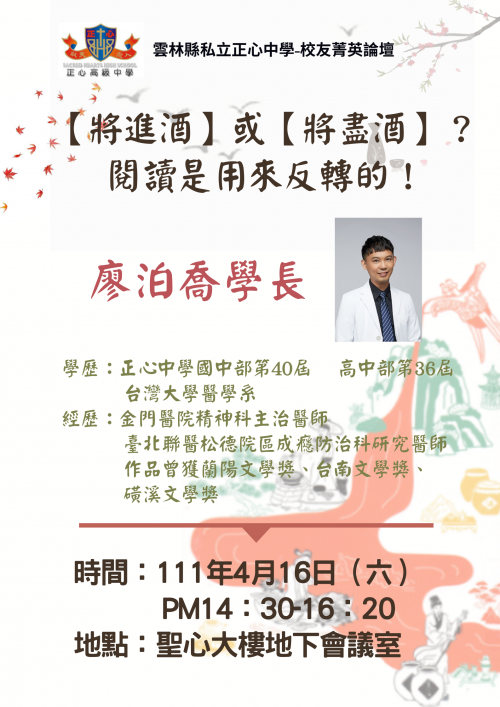 111年4月16日 舉辦校友菁英論壇【文豪酒癮診斷書—文學+醫學的跨界精彩作品】