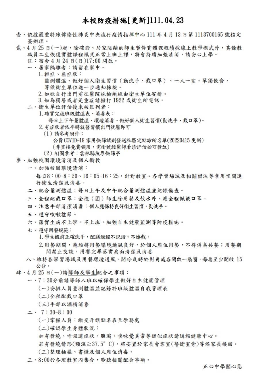 貳、4月25日(一)起,除確診、居家隔離的師生暫停實體課程續採線上教學模式外,其餘教職員工生恢復實體課程模式正常上班上課,將會持續加強清消,請安心上學。