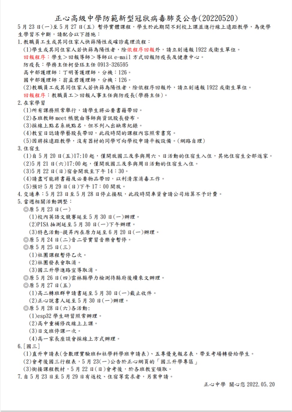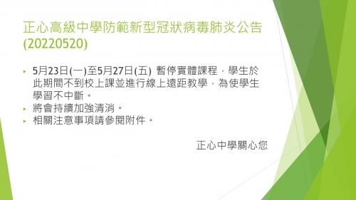 20 五月 【重要】正心高級中學防範新型冠狀病毒肺炎公告(5/20)-暫停實體課程 (111.05.20 13:20發佈) By 張承堯 正心校內大小事 0 回應s 正心高級中學防範新型冠狀病毒肺炎公告(5/20)-暫停實體課程 詳情請參閱附件公告 置頂截止日期: 2022-05-29附件檔案: 3 正心高級中學防範新型冠狀病毒肺炎公告(520)-暫停實體課程.pdf 3 正心高級中學防範新型冠狀病毒肺炎公告(520)-暫停實體課程.JPG 瀏覽次數:867