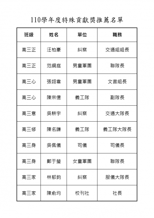27 五月 110學年度特殊貢獻獎名單 By 林柏亨 正心校內大小事 0 回應s 為鼓勵本校學生發揮服務奉獻之美德,並彰表同學在學期間之服務奉獻, 期使同儕及學弟妹們能見賢思齊,並營造友善校園。家長會長特設立此「特殊貢獻獎」, 於畢業典禮表揚對學校具有特殊服務貢獻之個人。 瀏覽次數:1798