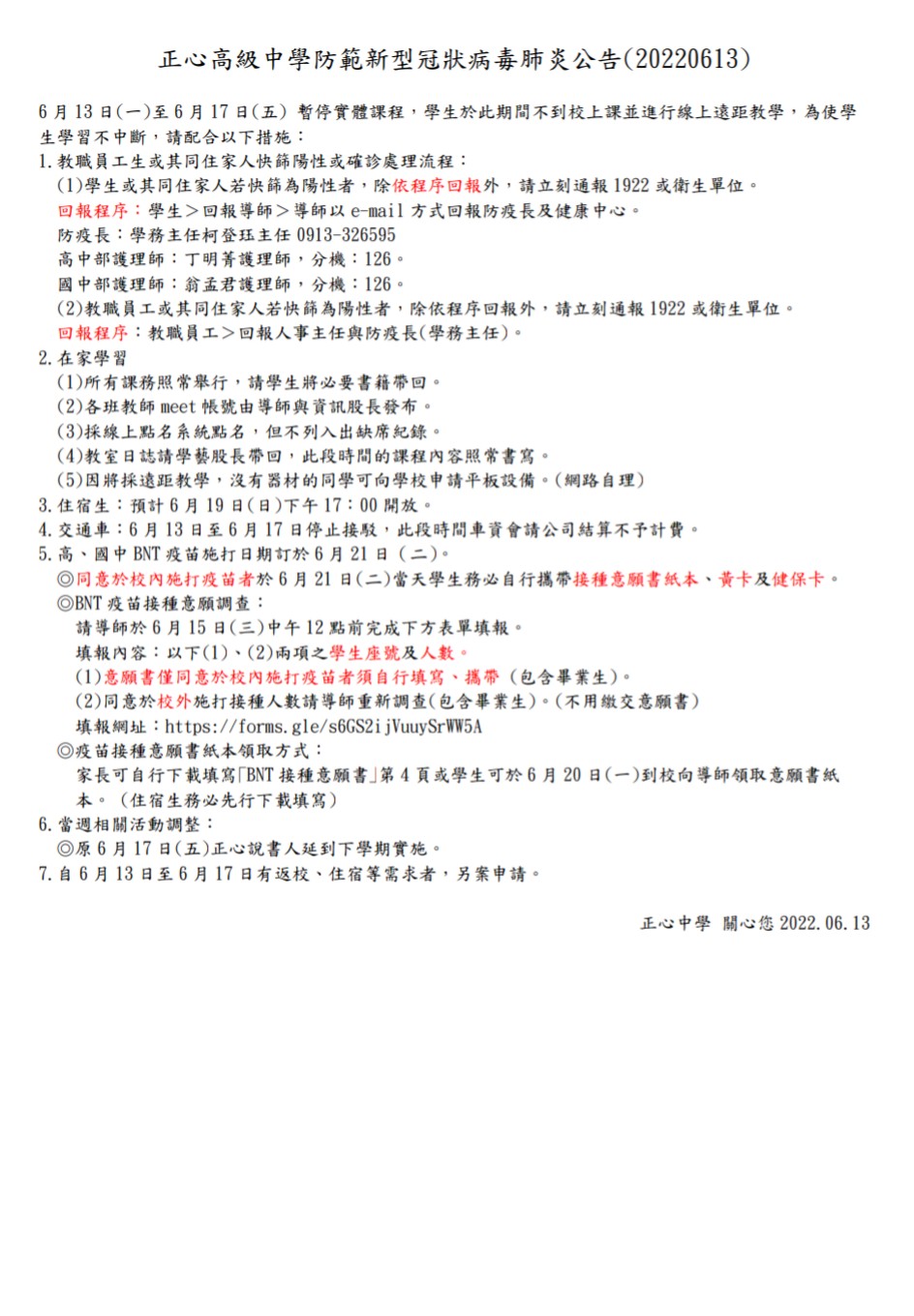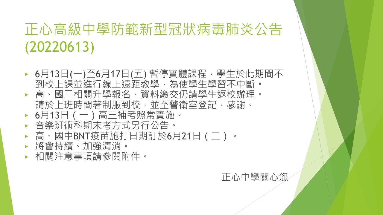 13 6 月 【重要】正心高級中學防範新型冠狀病毒肺炎公告(613)-暫停實體課程 By 張承堯 正心校內大小事 0 回應s 各位家長及同學平安 相關公告事項請參閱 置頂截止日期: 2022-06-18附件檔案: 3.4.1 正心高級中學防範新型冠狀病毒肺炎公告(0613)-暫停實體課程.jpg 3.4.2 正心高級中學防範新型冠狀病毒肺炎公告(613)-暫停實體課程.JPG 3.4.2 正心高級中學防範新型冠狀病毒肺炎公告(613)-暫停實體課程.pdf 3.4.2.1 BNT疫苗5-17歲接種評估暨意願書.pdf 瀏覽次數:767