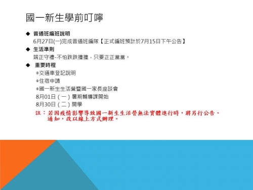 一、普通班編班說明:正式編班預計於 7 月 15 日下午公告