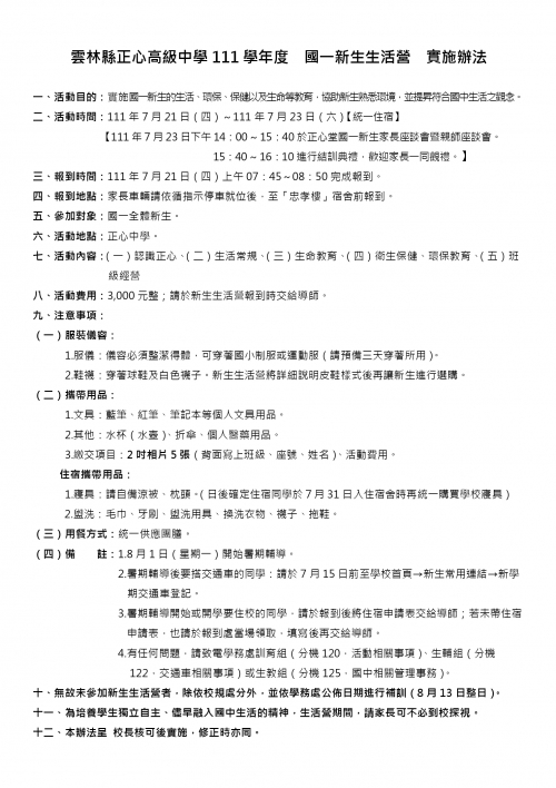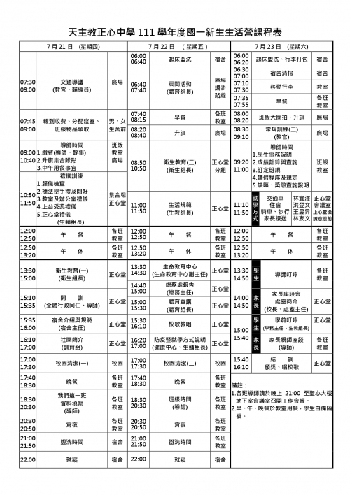 20 7 月 國一新生生活營辦法暨課程表及防疫措施說明 By 林柏亨 正心校內大小事 0 回應s 本校訂於7月21日(禮拜四)至7月23日(禮拜六), 辦理111學年國一新生生活營。 並於7月23日(禮拜六)下午14:00~15:30分, 辦理國一新生家長座談會, 歡迎所有國一新生家長蒞臨參與。 附件檔案: 01 111國一新生生活營實施辦法.pdf 02 111國一新生生活營 課程表(0713).jpg 01 新生生活營防疫措施說明.pdf 瀏覽次數:2899