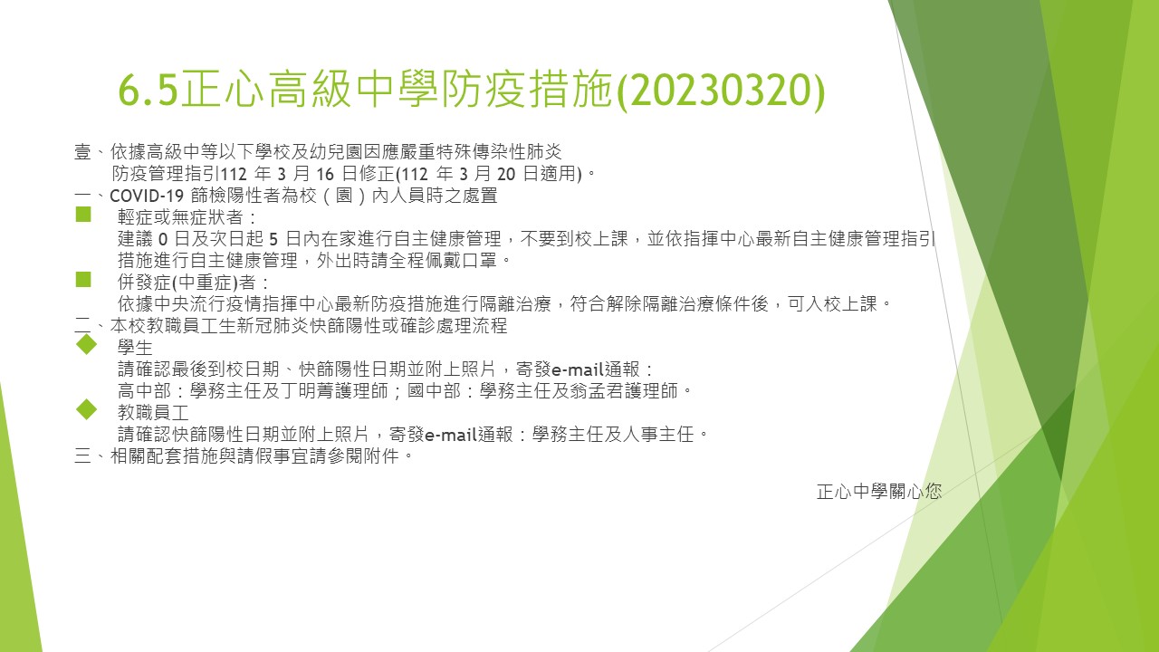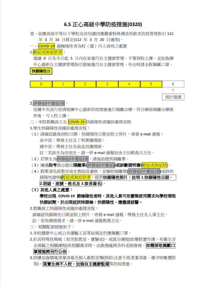 請確認最後到校日期、快篩陽性日期並附上照片,寄發e-mail通報:高中部:學務主任及丁明菁護理師;國中部:學務主任及翁孟君護理師。
