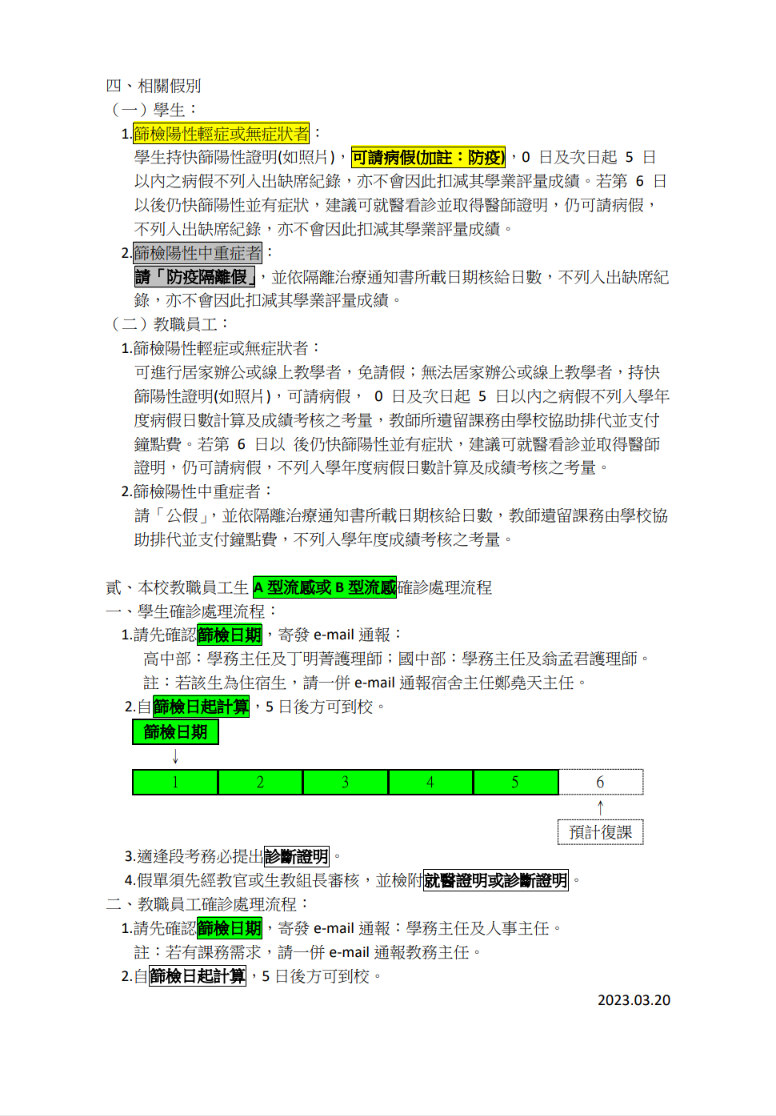 二、本校教職員工生新冠肺炎快篩陽性或確診處理流程