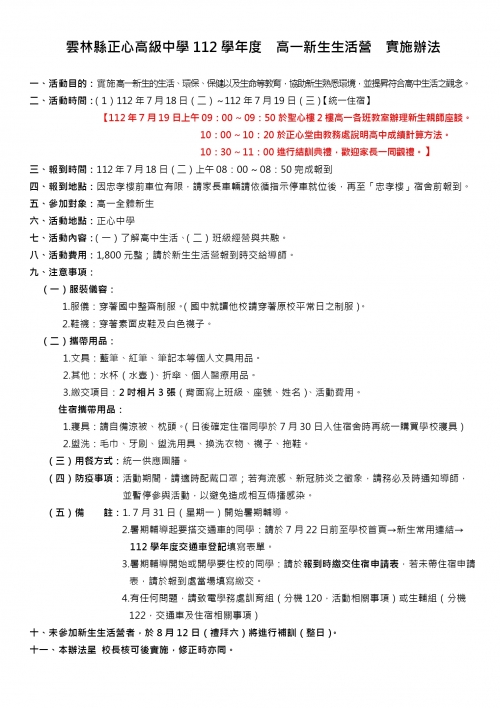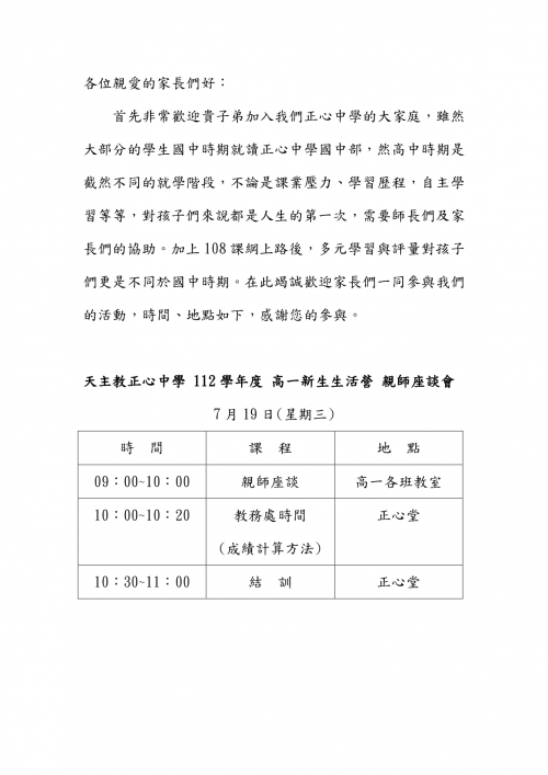 【112年7月19日上午09:00 ~ 09:50於聖心樓2樓高一各班教室辦理新生親師座談。