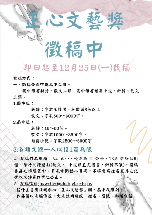 17 10 月 112正心文藝獎徵文 By 丁俊惠 正心校內大小事 0 回應s 如附件 附件檔案: Minimalist International Left Handers Day Poster.jpg 瀏覽次數:1030