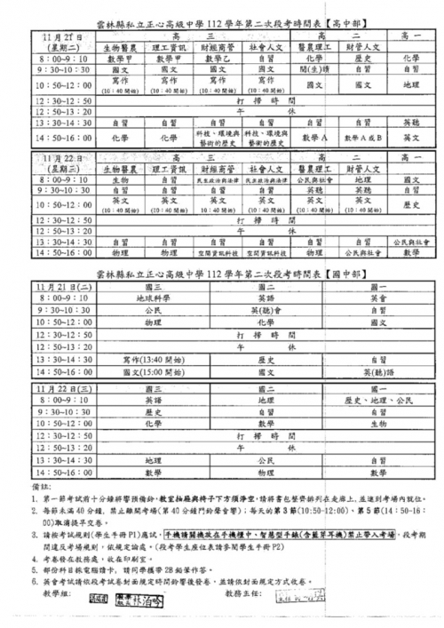 112學年度第一學期第二次段考考試時間表