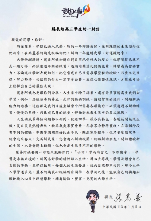 09 1 月 【縣長給高三學生的一封信】 By 蘇美霖 正心校內大小事 0 回應s 大學學測日期將近,縣長為高三學生加油勉勵。 置頂截止日期: 2024-01-23附件檔案: 縣長給高三學生的一封信.pdf 瀏覽次數:529