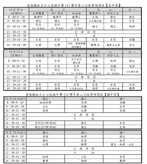 113學年度113年11月21日(四)~11月22日(五)第二次段考時間表