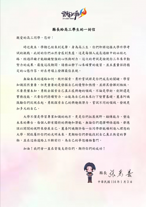 06 1 月 【縣長給高三學生的一封信】 By 蘇美霖 正心校內大小事 0 回應s 大學學測日期將近,縣長為高三學生加油勉勵。 置頂截止日期: 2025-01-21附件檔案: 縣長給高三學生的一封信.pdf 瀏覽次數:560