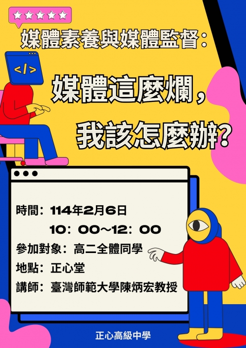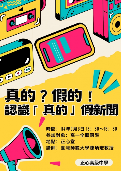 04 2 月 媒體識讀講座 By 林泊吟 正心校內大小事 0 回應s 週四兩節課是媒體識讀的講座 上午是高二參加,題目-媒體素養與監督 媒體這麼爛,我該怎麼辦 下午是高一參加,題目-真的?假的?認識[真的]假新聞 請參閱附件海報 講師:臺灣師範大學大眾傳播所陳炳宏教授 瀏覽次數:493