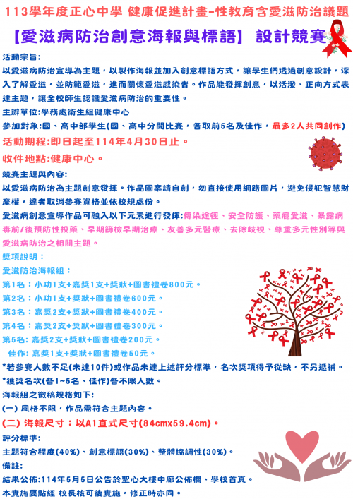 113學年度正心中學 健康促進計畫-性教育含愛滋防治議題【愛滋病防治創意海報與標語】設計競賽