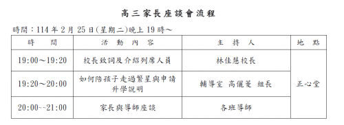 【歡迎】高三家長2/25(二)19:00參加家長座談會,地點:正心堂