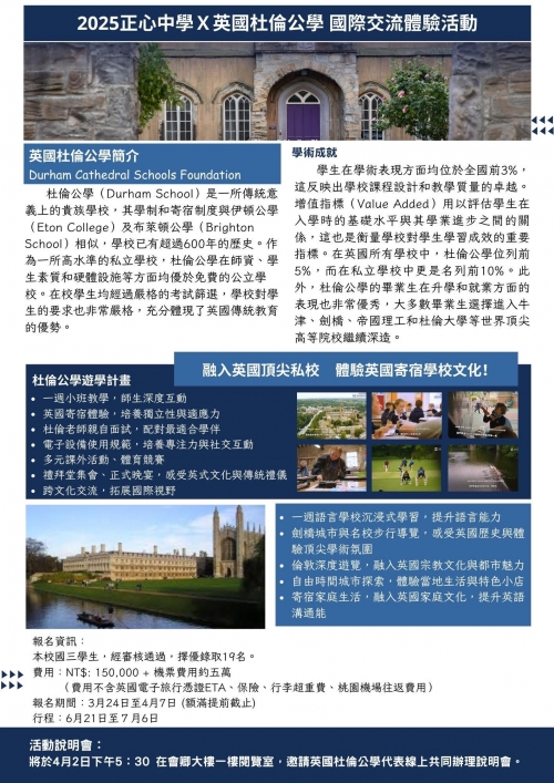 2025 正心中學-英國杜倫公學國際交流體驗活動