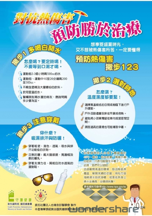 15 6 月 衛生福利部國民健康署檢送署「預防熱傷害」衛教單張電子檔,請全校師生務必查看。 By 陳威仁 正心校內大小事 0 回應s 台灣時序進入炎熱的夏季型態,各地出現高溫,使發生熱傷害的機會大幅增加。 衛生福利部國民健康署提供防範熱傷害衛教資料, 請全校師生前往察看。 置頂截止日期: 2016-06-20 瀏覽次數:1918
