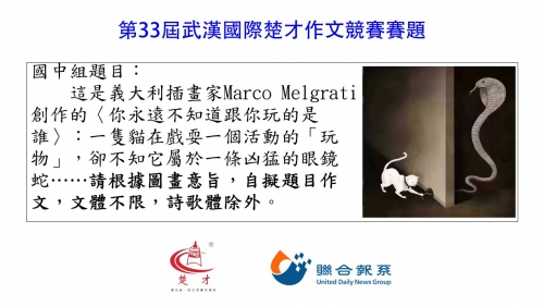 這是義大利插畫家Marco Melgrati創作的〈你永遠不知道跟你玩的是誰〉:一隻貓在戲耍一個活動的「玩物」,卻不知它屬於一條凶猛的眼鏡蛇……請根據圖畫意旨,自擬題目作文,文體不限,詩歌體除外。