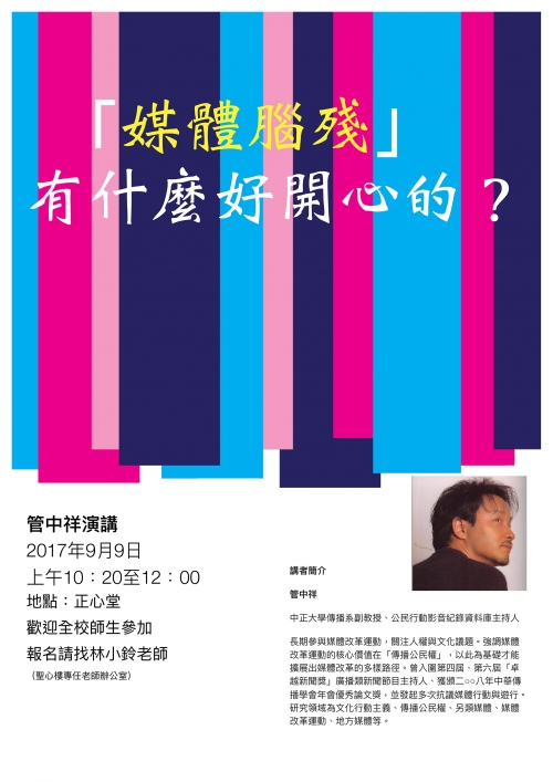 28 8 月 演講:「媒體腦殘」有什麼好開心的? By 正心中學 正心校內大小事 0 回應s 2017年09月09日 上午10:20 置頂截止日期: 2017-09-09附件檔案: 管中祥演講海報.jpg 瀏覽次數:2544