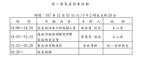 14 12 月 歡迎 高一家長 12/15(六)到校參加家長座談會 By 許純毓 正心校內大小事 0 回應s 愛的家長您好 訂於12月15日(星期六)下午14:00〜16:30,舉辦高一親師座談會,誠摯地歡迎家長到校參加。 瀏覽次數:2375